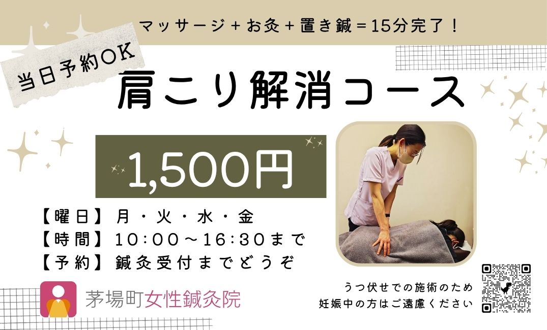 肩井の置き鍼、湧泉のお灸を含めて15分で完了する「肩こり解消コース」が大変好評をいただいております。